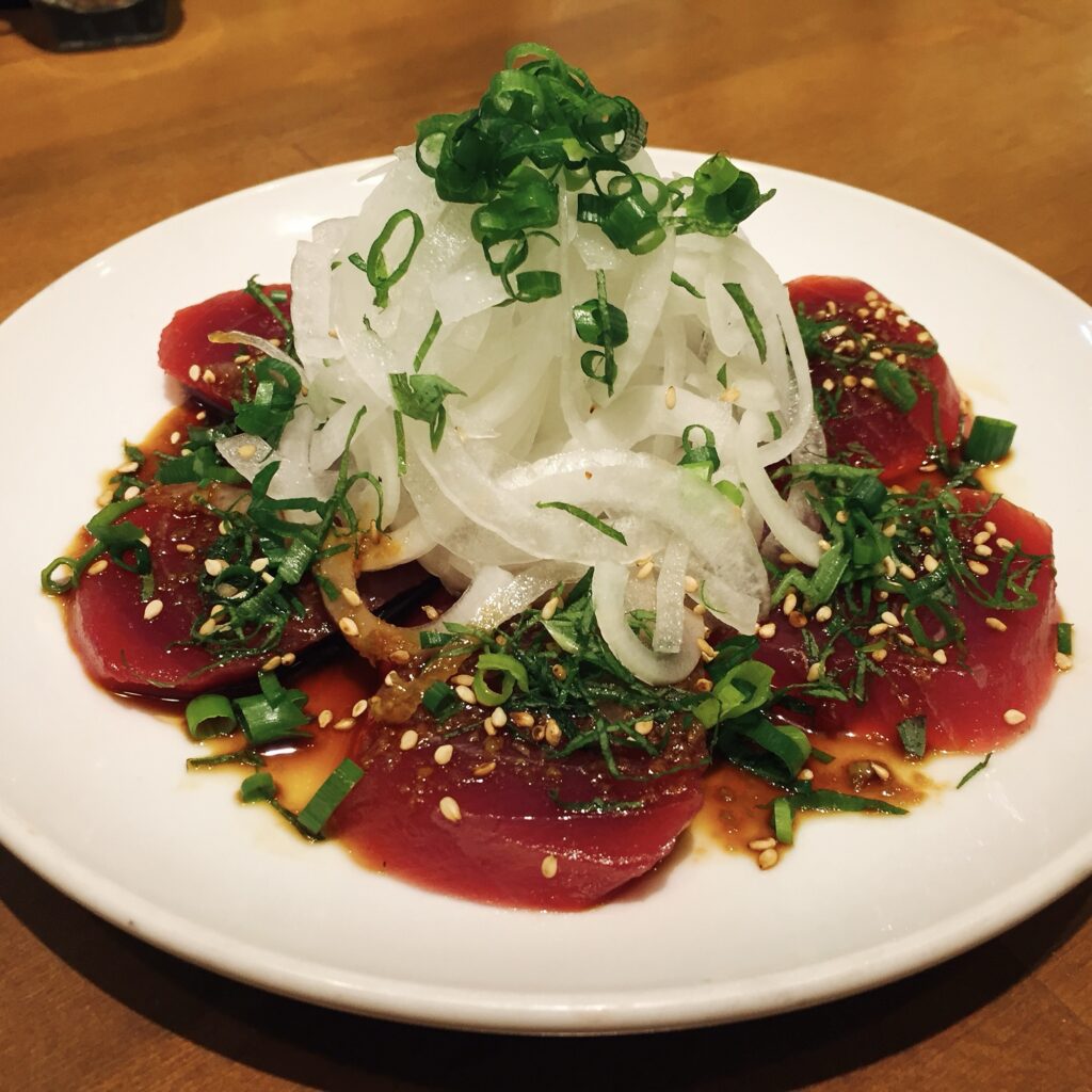 1.水にさらした新玉ねぎスライスを皿に盛り、カツオを並べソース、カイワレを盛り付ける。